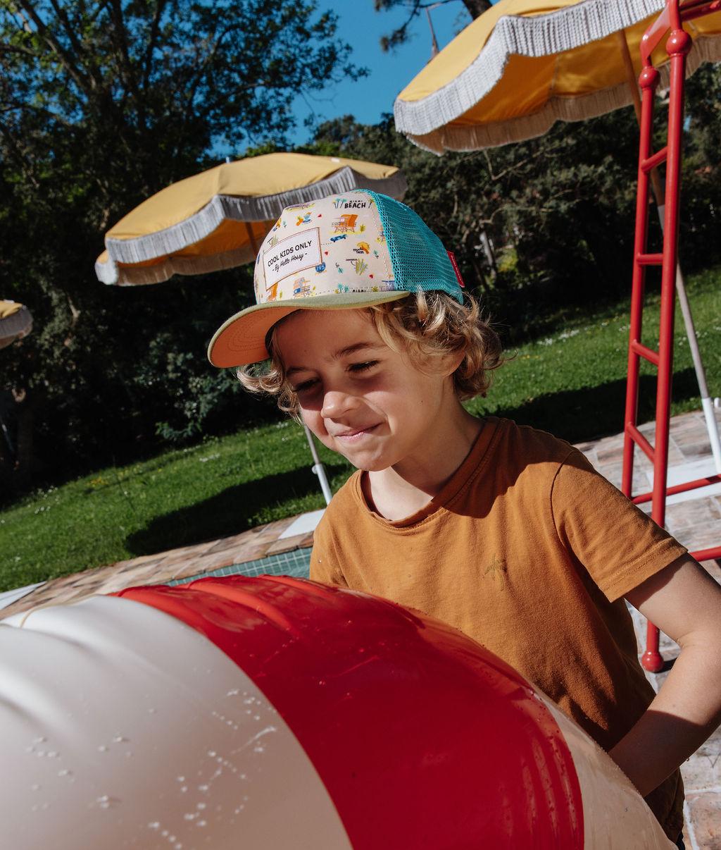 Découvrez la Casquette pour enfants et bébés, Miami Beach. Style trucker premium, motif solaire, visière courbée, disponible dès 9 mois. Pour les garçons : elle est à porter avec le maillot de bain du même Nom. Profitez-en.