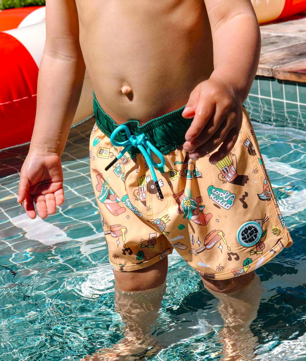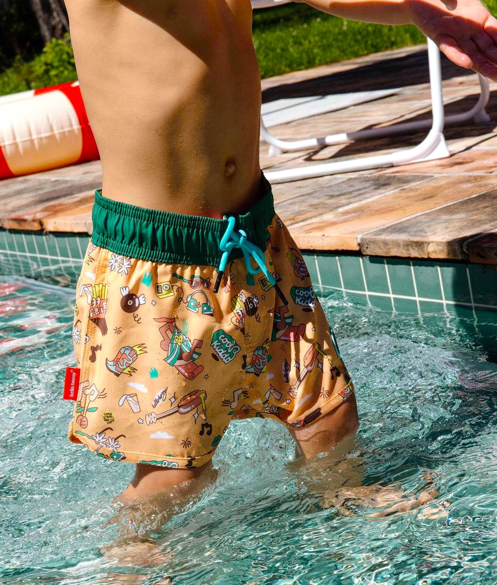 Découvrez le Maillot de bain pour garçons, Music Festival. Short de bain à motifs, anti-UV, résistant au chlore et au sel. Taille élastique avec cordon ajustable pour convenir à toutes les kids. Disponible en trois tailles, dès 3 ans.
